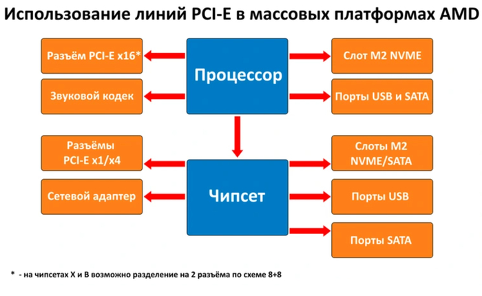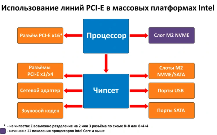 В массовых платформах 16 линий от процессора идет на слот для видеокарты. Платы на флагманских чипсетах позволяют «расщепить» его на несколько слотов по 4 или 8 линий на каждый. Еще 4 линии от процессора подключаются к слоту M2 NVME для высокоскоростных накопителей, но такой «прямой» слот встречается не везде. 4 или 8 линий используются для подключения процессора к чипсету на материнской плате. Чипсет распределяет их пропускную способность между разъемами USB, SATA и распаянными на материнскую плату контроллерами — такими, как звуковой чип, сетевой контроллер или дополнительный контроллер USB/SATA/Thunderbolt, если он имеется.