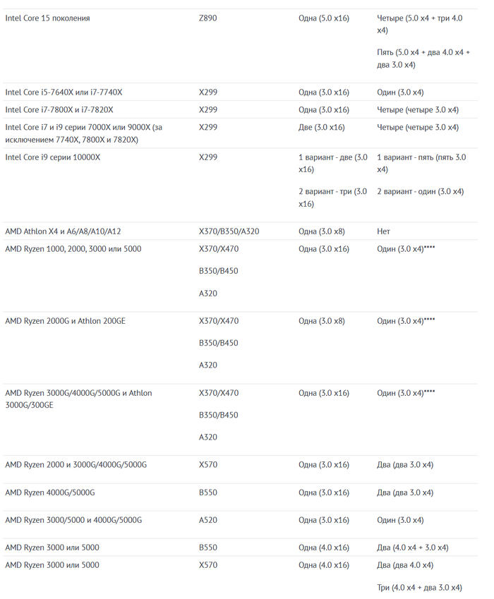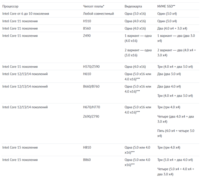 * - учитываются максимальные возможности чипсета. На некоторых материнских платах могут быть реализованы не все линии и слоты, позволяющие добиться такой конфигурации устройств.