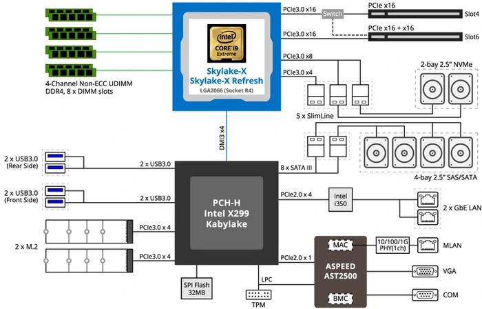 В отличие от массовых, высокопроизводительные HEDT-платформы всегда оснащались большим количеством линий PCI-E. Не стала исключением и последняя такая платформа от Intel на сокете 2066. Единственный чипсет, выпущенный для нее — X299, обладает 24 линиями PCI-E 3.0. Повышенное количество выделенных линий у таких платформ обеспечивают не чипсеты, а сами процессоры. Если у процессоров массовых платформ на данный момент от силы 20 линий PCI-E — 16 на видеокарту и 4 на накопитель, то у процессоров HEDT количество свободных линий для коммуникации с оборудованием может достигать 64.