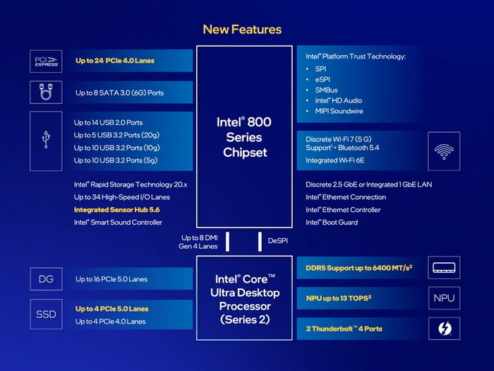 Как и у платформы LGA 1700, для связи чипсета с процессором используется шина DMI 4.0. У старшего Z890 она имеет 8 линий, у среднего B860 и младшего H810 — по 4 линии. Ключевое отличие от прошлого поколения в том, что теперь все собственные линии самих чипсетов относятся к PCI-E 4.0. У Z890 их 24, у B860 — 14, а у H810 — 8.