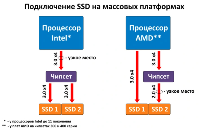 У чипсетов 300 и 400 серии AMD под процессоры Ryzen другая проблема: линии чипсета поддерживают лишь PCI-E 2.0. Поэтому при установке второго SSD в слот, подключенный к чипсету, он попросту потеряет половину своей скорости.