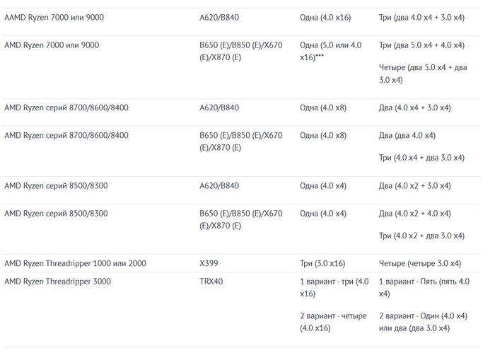 Старшие чипсеты X670, X670E и X870E предлагают до 12 линий PCI-E 4.0, «середнячки» B650, B650E, B850 и X870 — до 8. Младшие A620 и B840 имеют 8 линий PCI-E 3.0. При этом они сами, в отличие от прочих моделей, подключаются к процессору в «замедленном» режиме PCI-E 3.0 x4.
