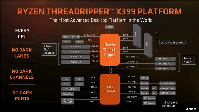 Первая современная HEDT-платформа от AMD использует сокет TR4 и чипсет X399. В отличие от Intel, у любого процессора AMD Threadripper первого или второго поколения под эту платформу стабильное количество свободных линий PCI-E 3.0 — 60. Еще 4 линии этой версии, а также 8 линий более медленного PCI-E 2.0 добавляет чипсет, который связывается с процессором по PCI-E 3.0 x4.