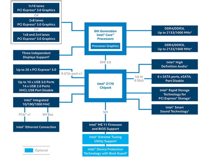 Процессоры этого поколения имеют 16 линий PCI-E 3.0 для видеокарты и соединяются с чипсетом посредством шины DMI 3.0 x4, которая базируется на той же версии PCI-E. Выделенной линии для накопителя NVME еще нет, для них используются линии от чипсета. Старший чипсет Z170 обладает 20 линиями третьей версии скоростного интерфейса, следующий за ним H170 — 16 линиями. У B150 12 линий, у младшего H110 — только 6. Платы на старшем чипсете умеют разделять слот видеокарты x16 на два слота по x8, или на три по схеме x8+x4+x4. Эта особенность сохранится и у всех последующих чипсетов Z-серии.