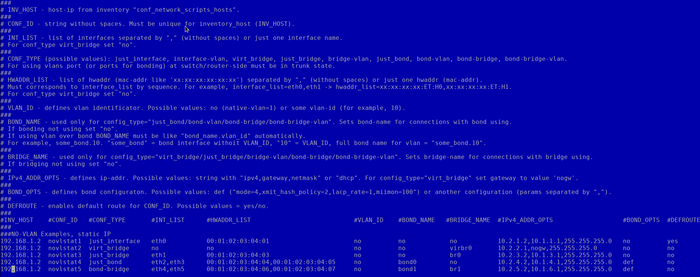 3. «../additional_configs/config_del_not_configured_ifcfg» - задаёт действие относительно тех ifcfg-файлов, которые не сконфигурированы в «../config». Если в «config_del_not_configured_ifcfg» вписать адрес хоста, то ansible-приложение удалит на remote-хосте все ifcfg-файлы, выключит соответствующие интерфейсы («ifdown») и удалит линки (через «ip link delete»), но только те, которые относятся к bond/bridge и vlan-интерфейсам (например, eth0.100). Настройка будет полезна в случая, когда, например, требуется переименовать какое-либо bond/bridge-соединение.