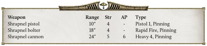 Эти шрапнельные снаряды можно зарядить практически в любой болтер — или болт-пистолет, или тяжёлый болтер — в вашей армии. Нет ничего лучше, чем свистящие облака металла, чтобы сбить с ног ваших противников и дать им новый набор неожиданных отверстий.