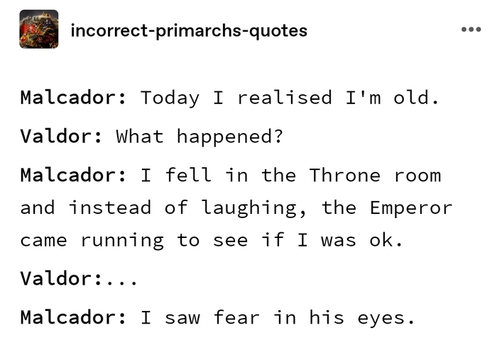 Малкадор: Я упал в Тронном зале и, вместо того чтобы посмеяться, Император подбежал чтобы убедиться, что всё нормально.