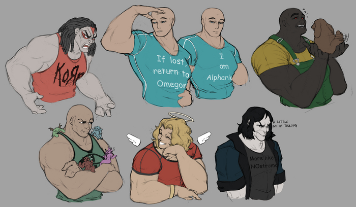 Ангрон в майке группы Korn (альтернативщики), Альфарий/Омегон (или наоборот, чтобы всех запутать?), надписи на майках - "в случае потери вернуть Омегону" и "я Альфарий", Вулкан, Хорус с мини-богами хаоса, Сангвиний, Кёрз - "маленький кусочек троллинга", надпись на майке - "больше похоже на НОстромо".