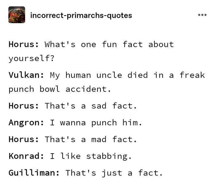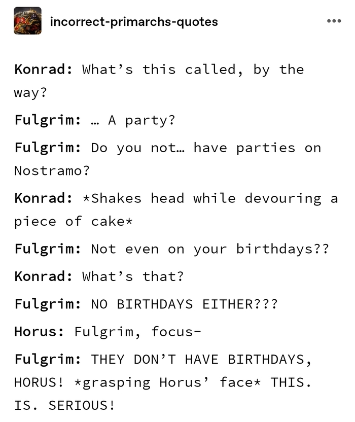 Фулгрим: У НИХ НЕТ ДНЕЙ РОЖДЕНИЯ, ХОРУС! *хватает Хоруса за лицо* ЭТО. СЕРЬ. ЁЗ. НО!