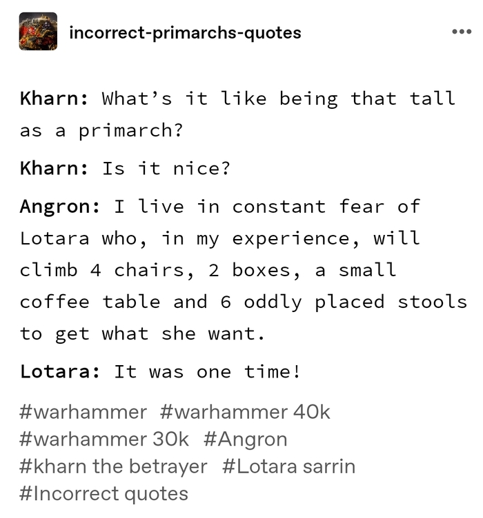 Ангрон: Я живу в постоянном страхе перед Лотарой, которая, по моему опыту, залезет на 4 стула, 2 коробки, маленький журнальный столик и 6 странно расставленных табуреток, чтобы получить то, что она хочет.