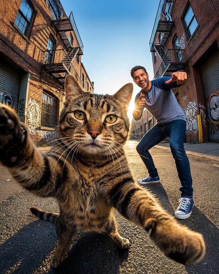 Кот расположен максимально близко к камере, создавая эффект гигантской перспективы: увеличенная мордочка, динамичный и забавный угол съёмки, ощущение настоящего селфи.
