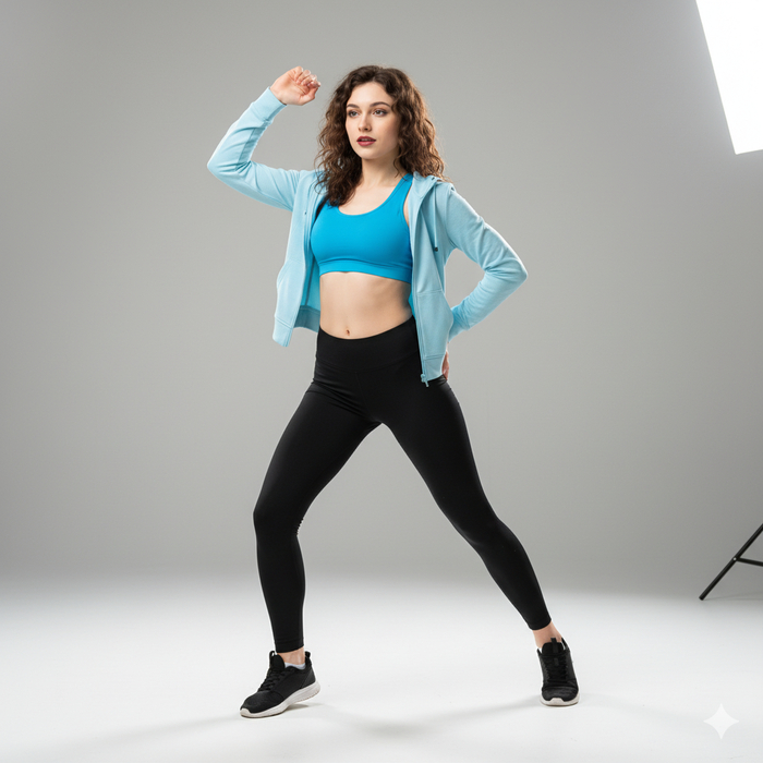Портрет полный рост, спортивная одежда [лосины + топ или спортивная куртка], стою в энергичной позе, студийный фон, яркое освещение, энергичная и активная атмосфера, спортивный образ. Не менять лицо, только одежду.