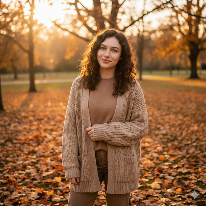 Полный рост, осенняя одежда [коричневый или бежевый цвет], теплый свитер или кардиган, осенний парк, листья на земле, золотой час, тёплое вечернее освещение, спокойная и уютная атмосфера. Не менять лицо, только образ и окружение.