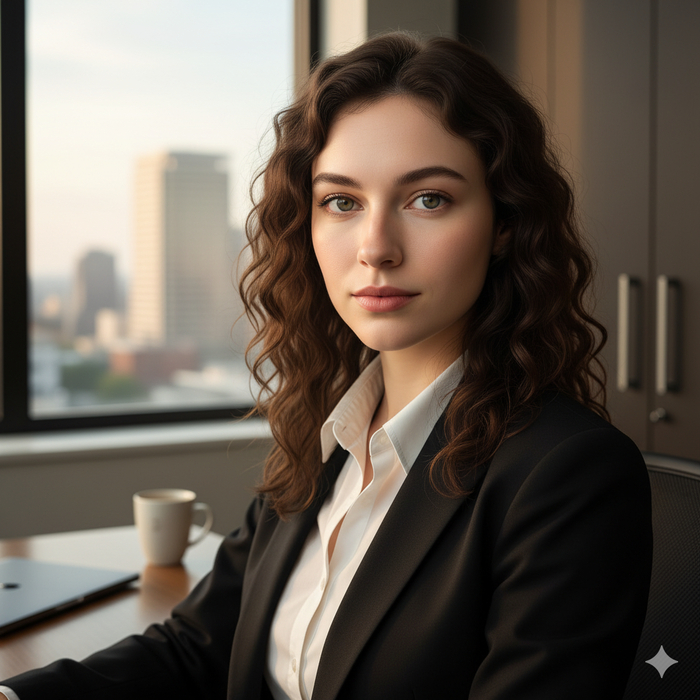 Портрет по пояс, женщина 30 лет, чёрный деловой пиджак, белая рубашка, смотрит в камеру, серьёзный профессиональный взгляд, офисный кабинет с окном, мягкое утреннее освещение, 85mm линза, f/2.0, деловая и уверенная атмосфера. Не менять лицо, только изменить одежду и фон.