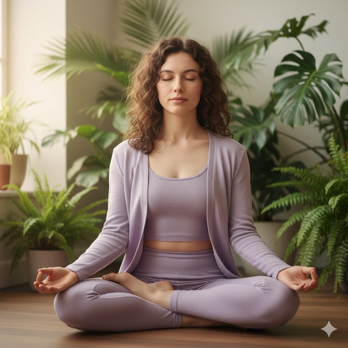 Портрет полный рост, мягкая спортивная одежда [пастельные цвета], спокойная поза йоги, природный фон или студия с растениями, мягкое освещение, спокойная и умиротворённая атмосфера. Не менять лицо.