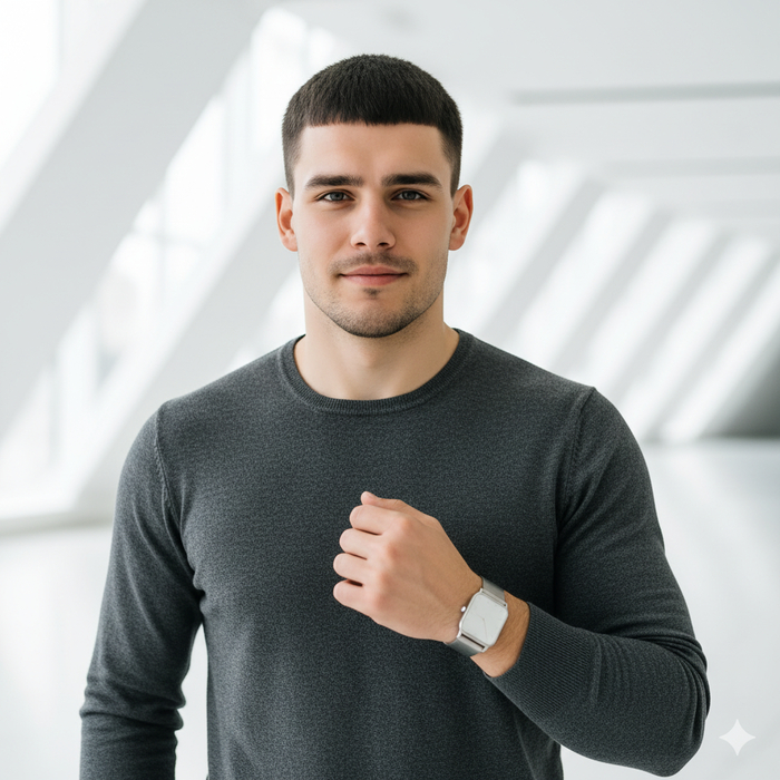 Портрет по пояс, молодой предприниматель, стильная повседневная одежда [чёрная или серая], минималистичный или современный фон, современное светлое освещение, инновационная и амбициозная атмосфера, 50mm линза. Сохранить лицо, изменить стиль одежды.