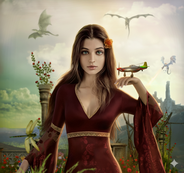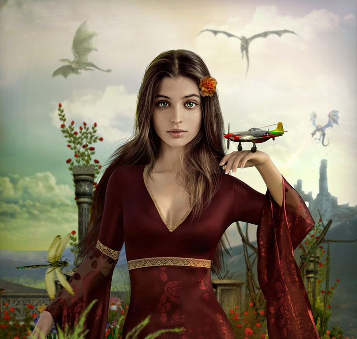 Согласование Освещения (Ключевое!): Необходимо полностью переработать освещение на женщине и модели самолета, чтобы оно соответствовало фону. Если фон освещен сзади (от драконов/заката), то:
