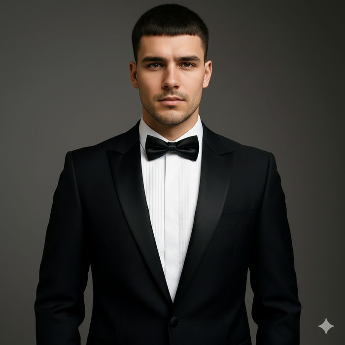 Портрет по пояс, чёрный смокинг, белая рубашка, чёрный галстук-бабочка, торжественный и элегантный взгляд, нейтральный фон, профессиональное вечернее освещение, величественная атмосфера. Сохранить лицо и позу.