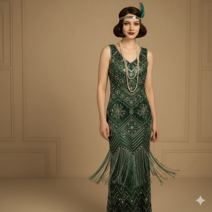 Портрет полный рост, платье 1920-х (украшено бусами и кисточками), волосы в стиле боб, макияж эпохи, студийный фон, мягкое студийное освещение, винтажная и элегантная атмосфера. Не менять лицо, только образ.