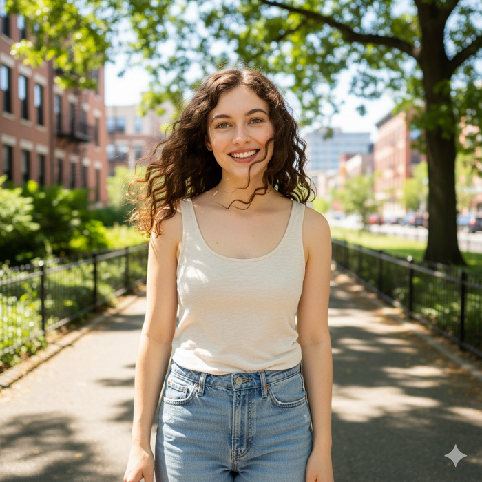 Портрет полный рост, светлая летняя одежда [джинсы + лёгкая майка], волосы развеваются, стою на улице, парк или городская улица, яркое солнечное освещение, весёлая и лёгкая атмосфера, естественная улыбка. Сохранить лицо и позу, изменить только одежду и фон.