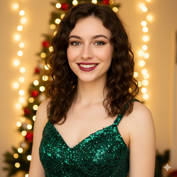 Портрет по пояс, коктейльное платье [выбери цвет], макияж, праздничная атмосфера, тёплое вечернее освещение, нарядная и весёлая обстановка. Сохранить лицо, изменить только одежду.
