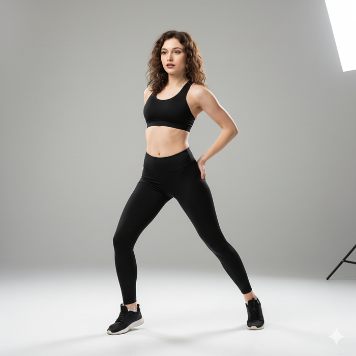 Портрет полный рост, чёрные спортивные лосины и топ, спортивная поза, спортзал или студия, яркое освещение, энергичная и мотивирующая атмосфера. Сохранить форму тела и лицо, изменить только одежду.