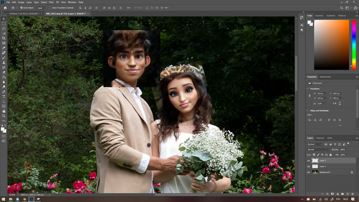 Шею, пиджак, волосы, цветы, фон и мою психику надо восстанавливать. Хотя бы моя лапоухость оставлена, хоть что-то работает ну очень хорошо. Далее копируем результат и вставляем его поверх оригинальной фотографии, примерно прикидывая размер и наклон головы.