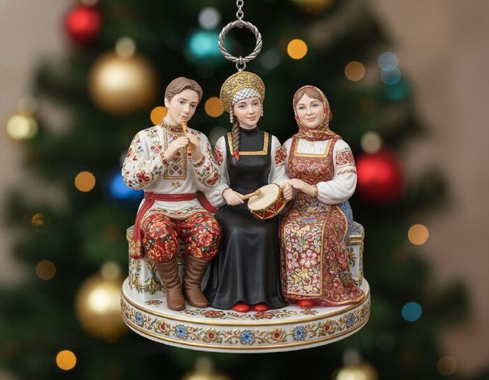НЕ МЕНЯЯ ЧЕРТЫ ЛИЦА персонажей, сгенерируй ёлочную игрушку в виде семьи из четырёх человек. Фигурки сидят вместе на круглой декоративной подставке, подвешенной на изящной цепочке. Все персонажи выполнены в стиле фарфоровой ёлочной игрушки — гладкая поверхность, лёгкий глянцевый блеск. Мужчина держит и играет на дудочке, девочка играет на небольшом барабане. Остальные члены семьи сидят рядом в спокойных, тёплых позах. Все персонажи одеты в традиционные русские народные костюмы с детализированными орнаментами и узорами. Фон мягко размыт (эффект боке), на нём угадываются ветви ели и тёплые светящиеся новогодние огоньки, создающие уютную праздничную атмосферу.