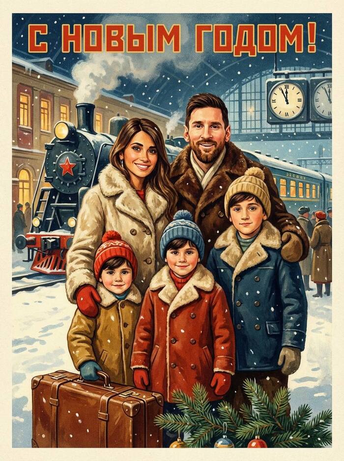 Используй ВСЕХ персонажей с прикреплённого фото. Обязательно сохрани реалистичное сходство, черты лица и пропорции, без карикатуры. Советская новогодняя открытка 1970-х годов. Иллюстрация гуашью и темперой на текстурной бумаге, лёгкая зернистость печати. Композиция: групповой портрет, персонажи стоят близко, слегка повернуты к камере, добрые полуулыбки. Зимняя одежда: шубы, меховые шапки, варежки. Фон: заснеженный железнодорожный вокзал, поезд с светящимися окнами, часы, пар в морозном воздухе, падающий снег. Внизу — чемодан и еловые ветви. Надпись «С НОВЫМ ГОДОМ!» в стиле советского плаката, узкая светлая рамка. Палитра тёплая, ностальгическая.