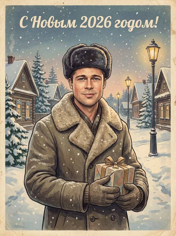 Используйте загруженную фотографию как ЕДИНСТВЕННЫЙ и ТОЧНЫЙ эталон лица. Сохраняйте идентичность лица с абсолютным приоритетом: точная геометрия лица, пропорции и сходство. Никаких украшений, никакой стилизации, никаких изменений в лице. В случае возникновения каких—либо противоречий - сохраняйте лицо в точности. Иллюстрация к старинной советской новогодней открытке (1950-1960–е годы). Молодой человек в теплом зимнем пальто с меховым воротником, вязаных перчатках и ушанке. Держит в руках завернутый новогодний подарок. Спокойная, нежная улыбка. Фон: заснеженная советская деревенская улица, деревянные дома, ели, старинные уличные фонари, зимний вечер. Стиль: советская открытка ручной росписи, приглушенные пастельные тона, слегка выцветшие цвета, текстура старой бумаги. Никаких современных элементов. Никакого гиперреализма. Текст вверху: «С новым 2026 годом!»