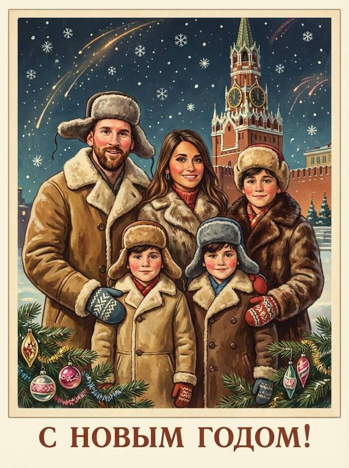Используй ВСЕХ персонажей с прикреплённого фото. Сохрани точное сходство лиц и мимику, без мультяшности. Иллюстрация как советская новогодняя открытка конца 1950-х. Живописная техника гуашь/темпера, шероховатая бумага, мягкий растр. Композиция: персонажи стоят вместе, слегка повернуты к камере, тёплые полуулыбки. Одежда: зимние шубы, меховые шапки, варежки с орнаментом. Фон: деревянный почтовый ящик «Почта Деда Мороза», сугробы, заснеженные ели, гирлянды лампочек, крупные снежинки. Внизу — мешок с письмами и игрушки. Надпись «С НОВЫМ ГОДОМ!» в советской типографике, светлая рамка. Цвета винтажные, мягкие.
