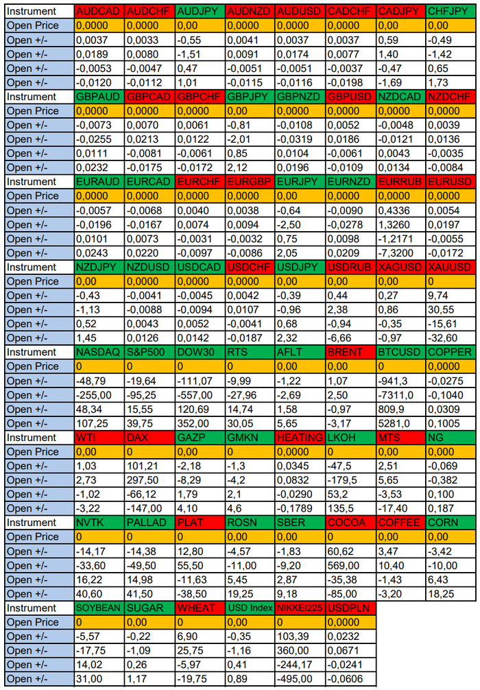 Весь перечень анализируемых активов указан ниже в общем количестве 62 инструмента. Здесь Вы найдете активы рынка Форекс, популярные активы Московской биржи, не менее популярные активы Чикагской биржи СМЕ и мажор криптовалютного сегмента - Биткоин, за которым следуют все альткоины.