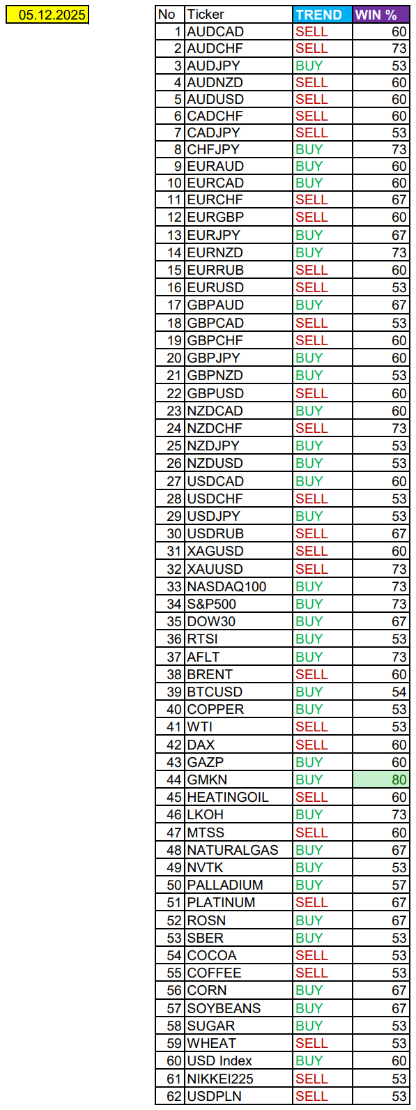 Очередные сезонные тенденции на пятницу 05 декабря 2025 по основным мажорам финансовых рынков.
