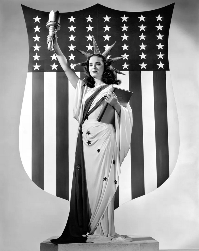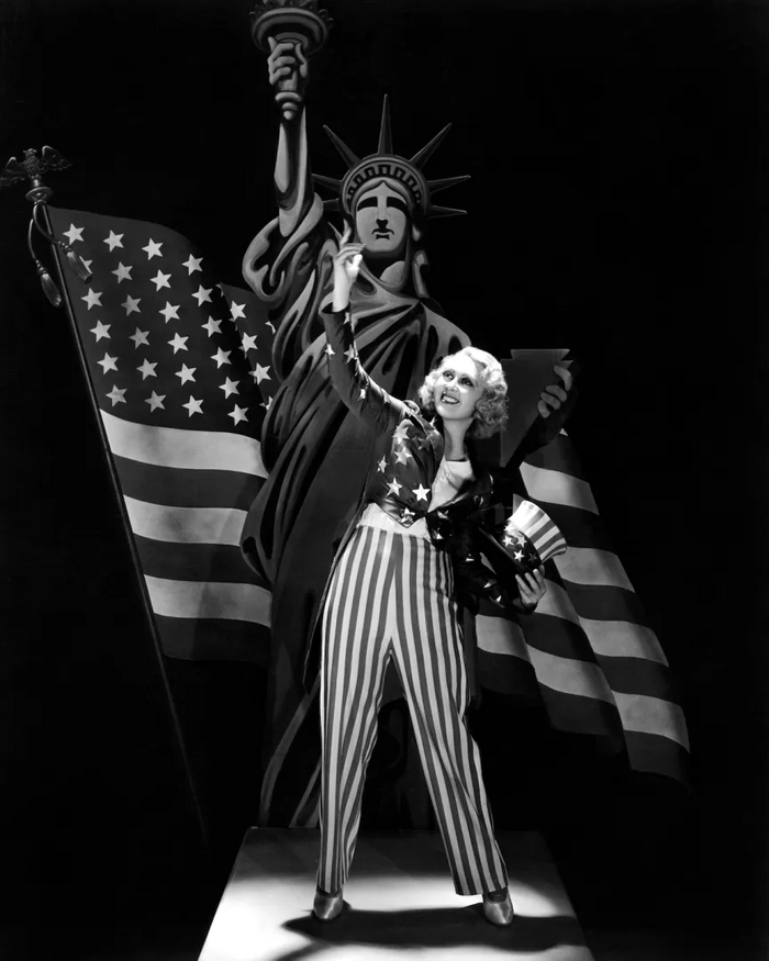 Звезда эпохи Pre-code Джоан Блонделл была хорошо известна своей яркой улыбкой и дерзким присутствием. Здесь она демонстрирует свой неповторимый шарм, позируя в чрезмерно патриотическом костюме на фоне флага и Статуи Свободы.