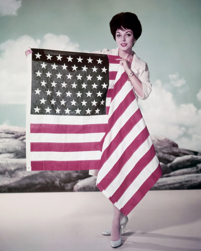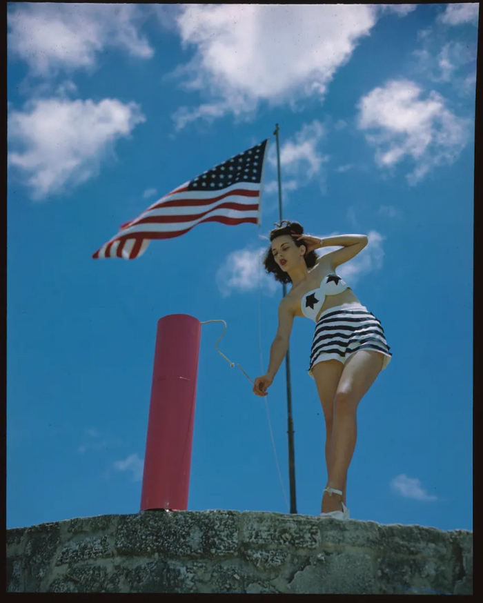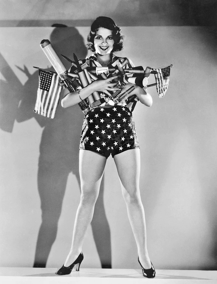 4 июля мгновенно вызывает в воображении образы американских флагов и фейерверков. С 20-х по 60-е годы Голливуд часто использовал эту патриотическую символику для создания забавных пинап-фото с кинозвездами. Особенно в период Второй мировой войны патриотические пинапы поднимали боевой дух и делали празднование страны гламурным.