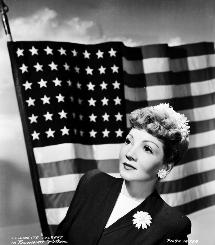Оскароносная актриса Клодетт Колбер, сыгравшая в таких классических фильмах, как «Это случилось однажды ночью» и «История из Палм-Бич», на этом снимке кажется глубоко задумавшейся о духе 4 июля.