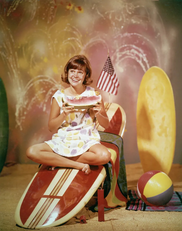 В своих днях Гиджет Салли Филд демонстрирует идеальный летний образ с арбузом, доской для серфинга, флагом и фоном из праздничных фейерверков.