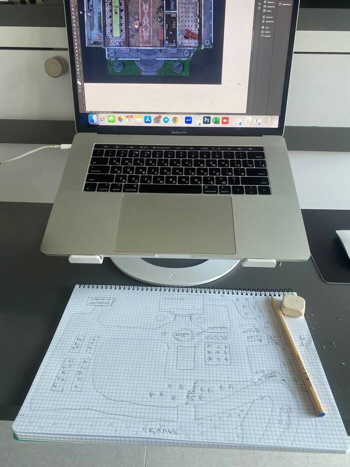 Я пошёл по своему пути и нашёл 2D-дизайнера, с которой мы нарисовали карту. По этой карте я полностью доработал прохождение, раскидав предметы и главные точки на ней в Photoshop. Начал искать разработчиков, моделлера и мы приступили.