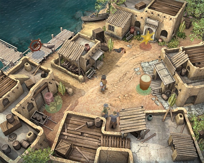Интерфейс Swashbucklers достаточно упрощён и часто минимализирован. Фактически, в Swashbucklers есть несколько интерфейсов из-за его смешанного стиля игры. Пока вы бродите по портовым городам, здесь вообще нет системы HUD. Но, опять же, передвижение по городам не вызывает сложности. Все важные здания отмечены плавающим символом. Перемещаетесь по миру, как в городах, так и на открытом море, используя кнопки джойпада. Сначала управление казалось немного неуклюжими, особенно при плавании, но я привык к ним.