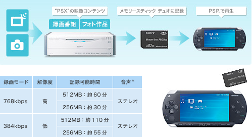 Именно в последнее поколение была добавлена поддержка Sony PSP, но игры и UMD не поддерживались. Программы, записанные PSX, конвертировались в формат видео для PSP. Через карту Memory Stick их можно было смотреть на PSP.