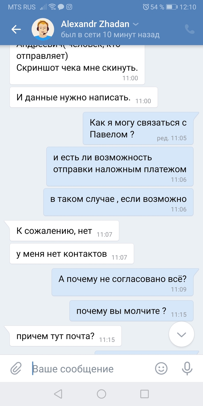 После сообщения "пирчём тут почта", он перестал отвечать на сообщения.
