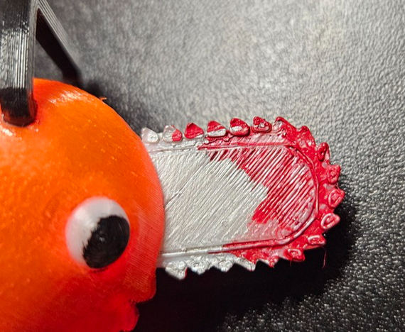 У цветного, конечно, совсем кривые зубья пилы, не зря советовали печатать на 120%. Красить не умею, поэтому сделал как мог, лишь бы издалека на полке смотрелся симпотно. Плоскость пилы совсем "полосатая" вышла при данной толщине печати. Из интересного можно отметить глаза, на фото ниже 3 фейловых попытки: