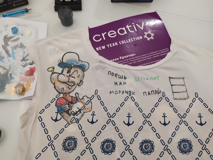Доброго времени суток, пикабушники! Итак! Снова возникла идея нарисовать что- нибудь! Порылся в шкафу у супруги и была выделена мне на растерзание очередная футболка белого цвета с якорями и прочей морской атрибутикой. Идея возникла сама собой. Порылся в инете, нашёл подходящий принт. И начал рисовать