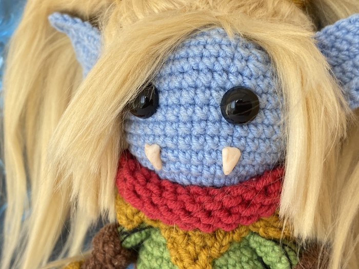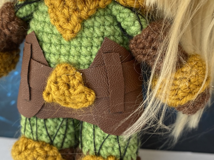 Выполнена из хлопковой пряди, в качестве вставок кожаные элементы, волосы из синтетического войлока, детали из запекаемой полимерной глины.