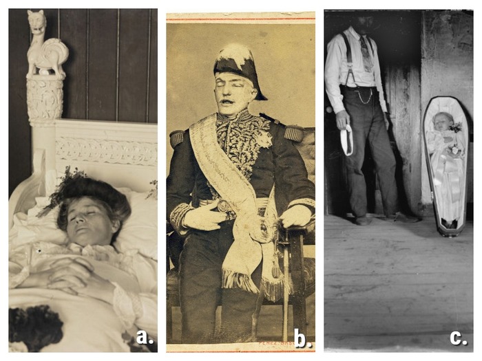 Первые два вида посмертной фотографии основаны на идее отрицания смерти через иллюзию того, что усопший жив, а третий — на реалистичном изображении смерти (на таких снимках акцент со временем переместился с покойного на скорбящих).