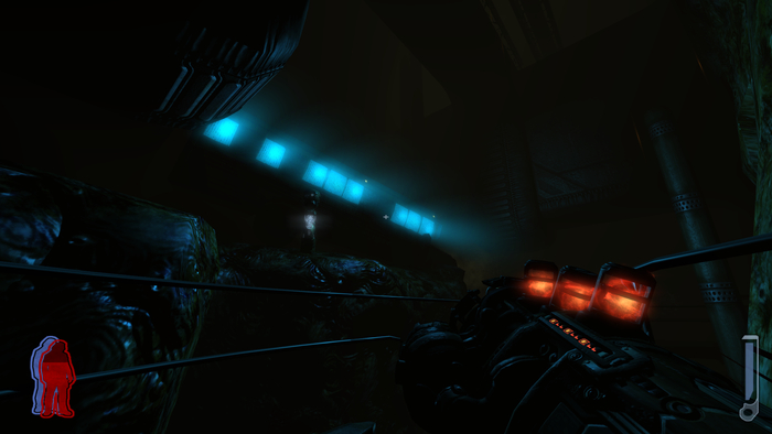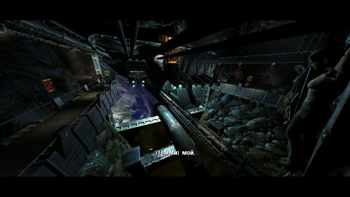 Ну и транспорт — в виде летающих платформ — позволяет исследовать огромные участки корабля. Иногда хочется просто остановиться и осмотреться. Это впечатляющие по масштабу пространства, особенно если вспомнить, что игра работает на движке id Tech 4 — том самом, где Doom 3 не мог себе позволить и половины такого размаха.