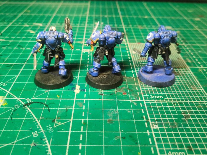 Начал сборку, благо клей для пластика, нож и кусачки были. Дальше грунтовка и конечно покрас после пары видео гайдов на ютубе. В наличии был несколько баночек краски от армипеинтера, да проливка. Было решено красить в самых банальных ультрамаринов. Одного парня покрасил из аэрографа, который приобрел для моделизма. Первый раз получился сносным, сейчас конечно я вижу свои косяки, но пусть они так и остаются, но тогда мне казалось, что покрашено чуть ли не идеально.