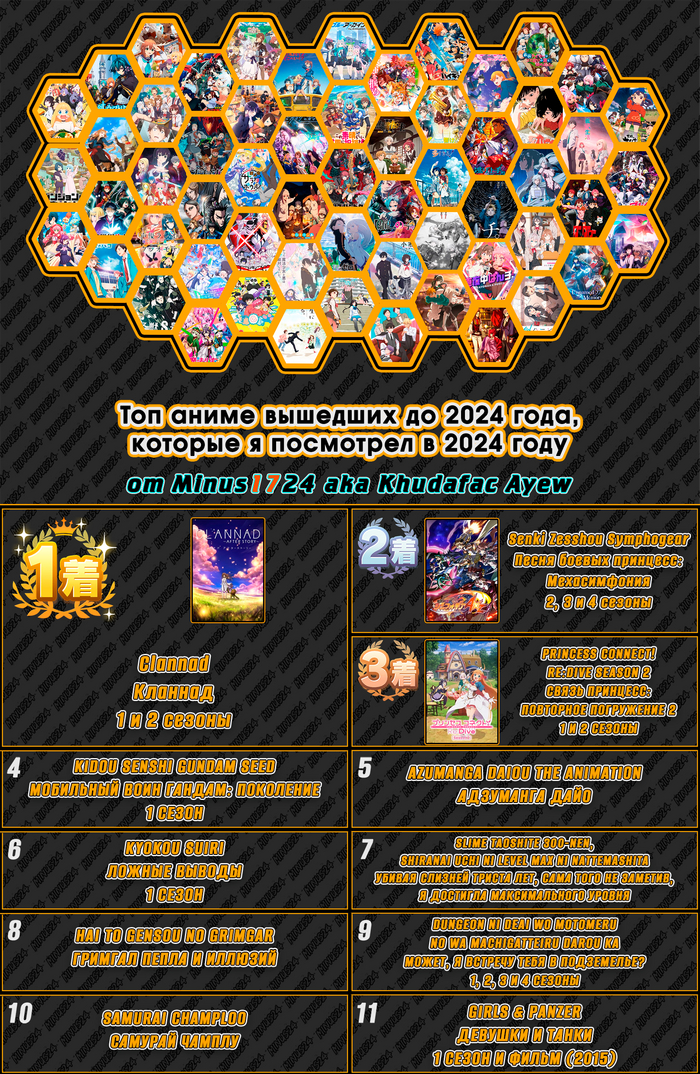За 2024 год я посмотрел приличное количество отличных аниме. И мне очень тяжело было расставлять места с 3 по 11. Ибо они во многом для меня на схожем уровне. А вот с первыми двумя вопросов не было. Хотя что-то мне подсказывает, что если бы я посмотрел пятый сезон Симфы, то он бы с Кланнадом поборолся за первое место.