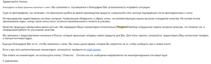 Хм, не порядок. И решила я написать производителю. Все-так известная компания, со статусом. Написала, мол так и так, вот какой косяк у вас обнаружила, отправила фото самой чипсины и фото серии с упаковки, в общем, все по уму. Ответ не заставил себя долго ждать: