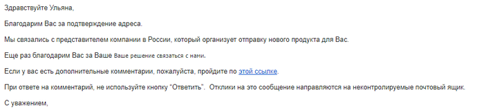 Ах, красота! Все бы в России так работало! Да еще и про новую продукцию говорят. Я отправила им свой адрес и вскоре получила еще один ответ: